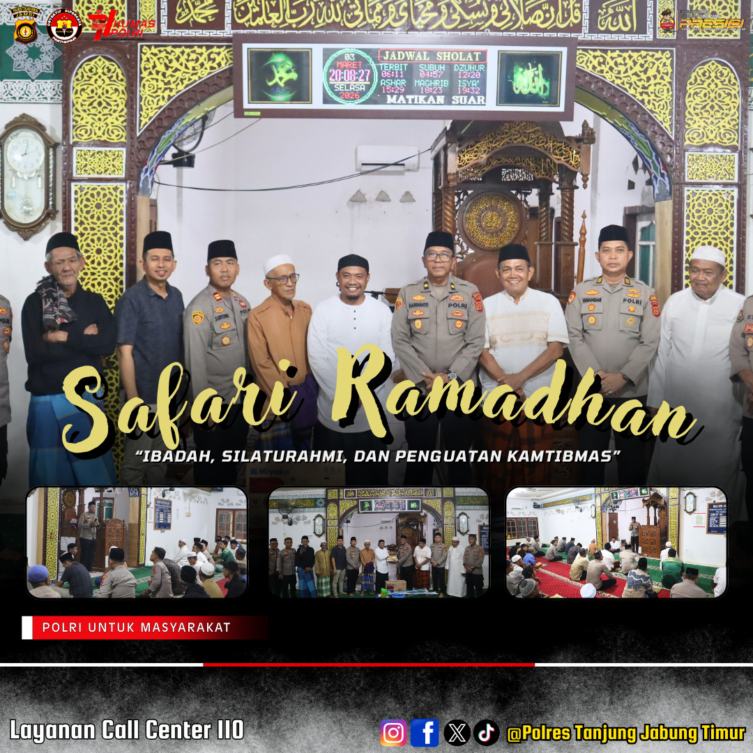 TANJABTIM,Suaradayadigital.com-Kegiatan Safari Ramadhan Polres Tanjung Jabung Timur kembali dilaksanakan sebagai bentuk silaturahmi dan kedekatan Polri dengan masyarakat di Masjid Nurul Huda Kecamatan Geragai. Selasa (04/03/2026).