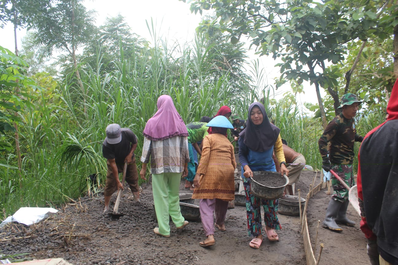 Di lokasi pengecoran, loreng TNI dan kain daster ibu-ibu berpadu dalam satu irama kerja. Mereka saling menyemangati, saling menguatkan. Rabat beton yang dicor hari itu bukan hanya menghubungkan satu titik ke titik lain, tetapi juga menyatukan hati dalam satu tujuan: kemajuan desa.