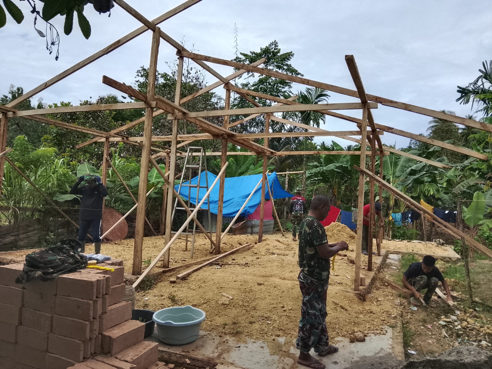 Satuan Tugas (Satgas) TMMD terus bekerja dengan penuh dedikasi untuk memastikan setiap detail rangka rumah dibangun sesuai standar kelayakan bangunan.
