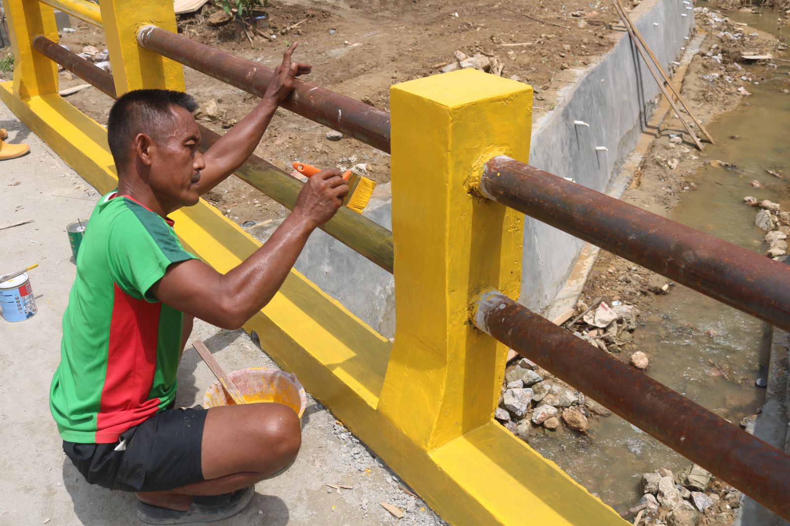 Pada Selasa (10/3), sejumlah anggota TNI terlihat bahu-membahu melaksanakan proses pengecatan pagar jembatan yang menjadi akses vital bagi warga sekitar.