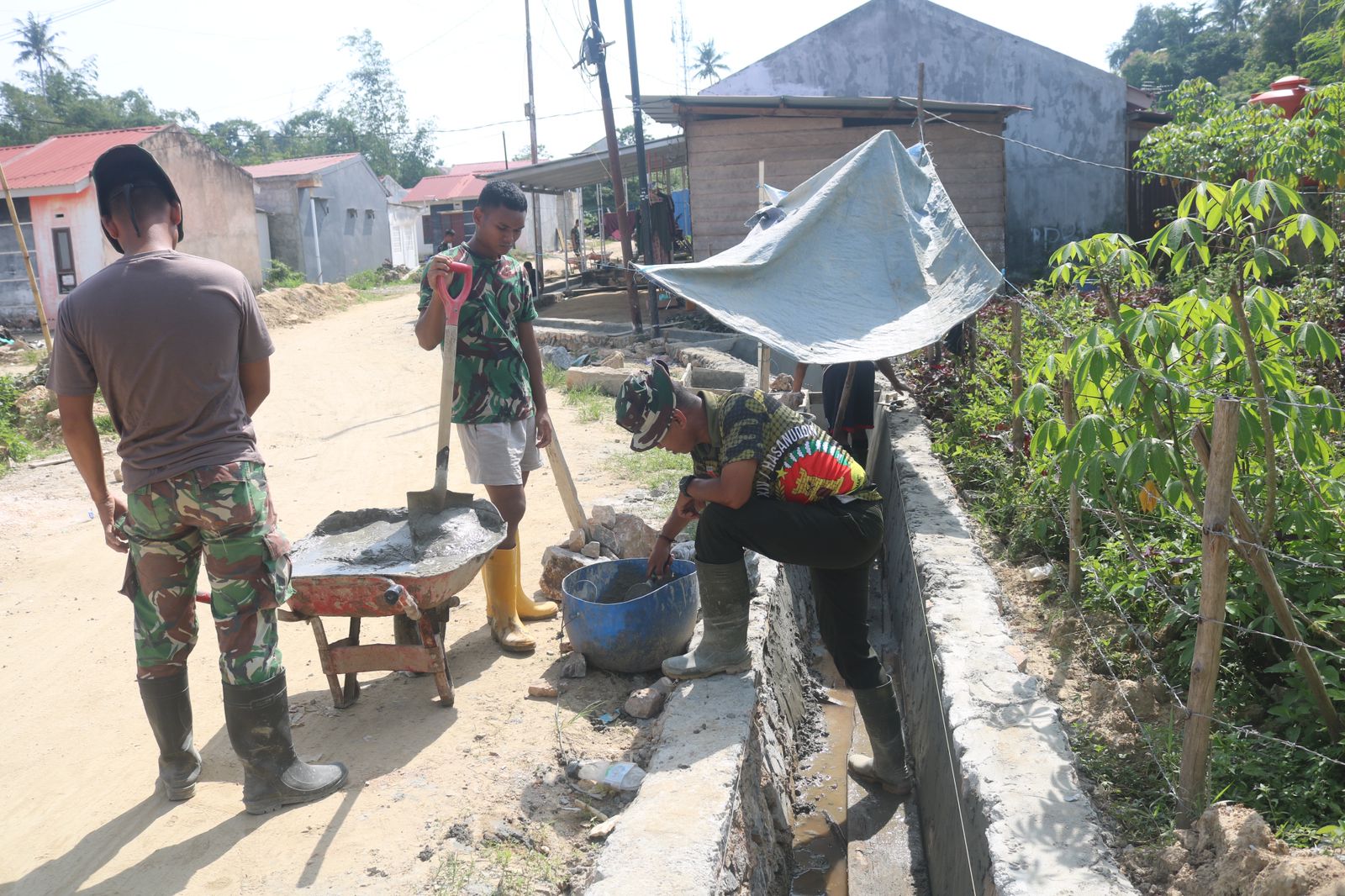 Pada Senin (9/3), sejumlah personel terlihat bahu-membahu melakukan proses plasteran dinding saluran air atau drainase.