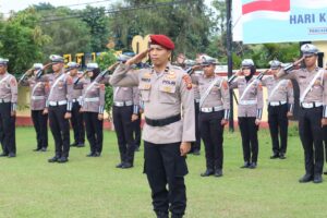 TANJABTIM,Suaradayadigital.com – Wakapolres Tanjung Jabung Timur Kompol Dr. Novrizal, S.Sos., M.H bertindak sebagai inspektur upacara pada peringatan Hari Kesaktian Pancasila yang digelar di halaman Mapolres Tanjung Jabung Timur, Rabu (1/10/2025). Upacara ini mengusung tema Pancasila Perekat Bangsa Menuju Indonesia Raya dengan pembacaan Teks Pancasila, Undang Undang Dasar 1945 dan Ikrar Hari Kesaktian Pancasila.