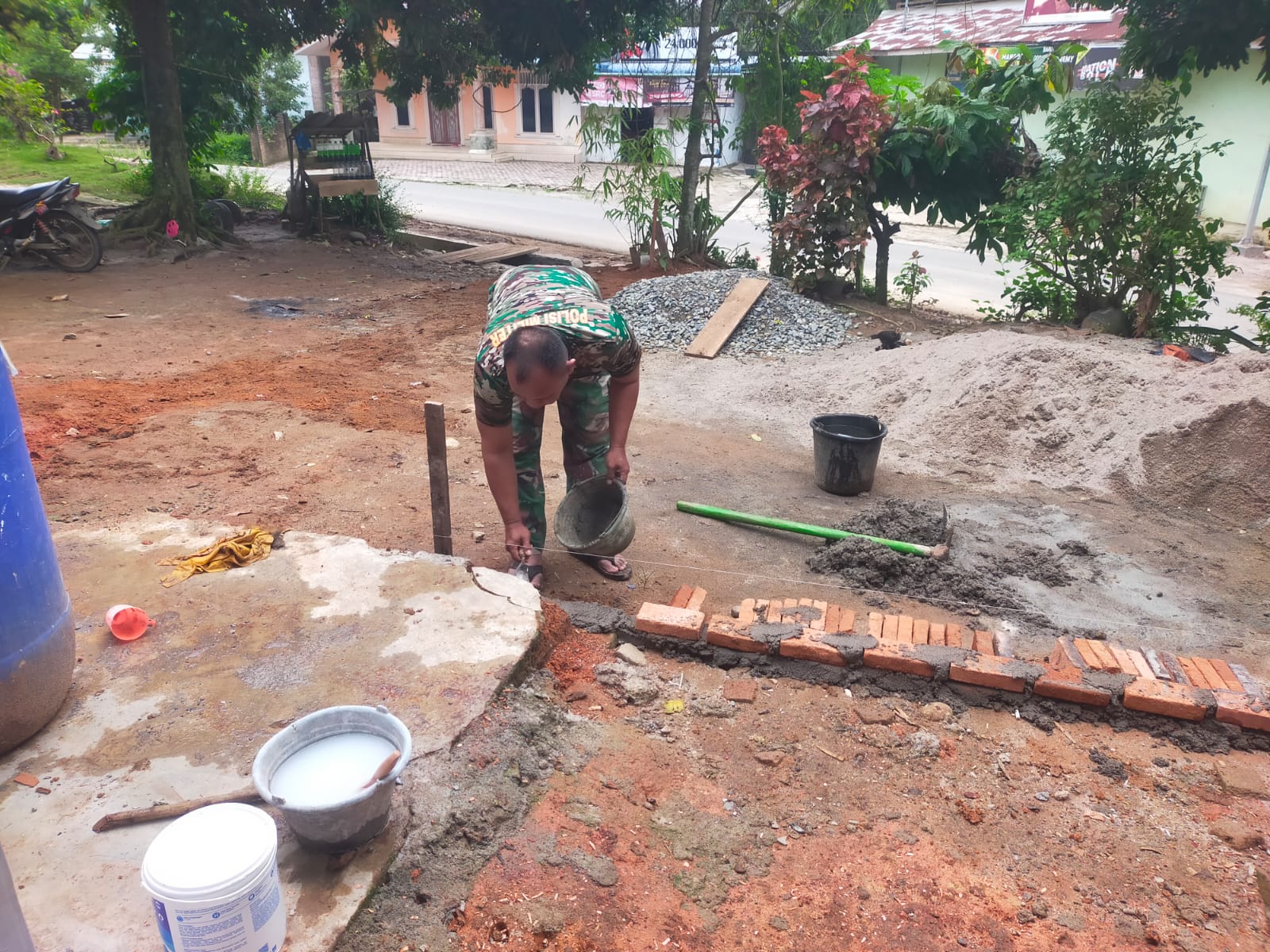 Dalam pantauan di lokasi, terlihat salah satu anggota Satgas TMMD dengan penuh ketelitian memasang dan merapikan susunan bata merah yang membentuk batas teras. Pekerjaan ini dilakukan dengan cermat untuk memastikan teras kokoh, rapi, dan simetris.