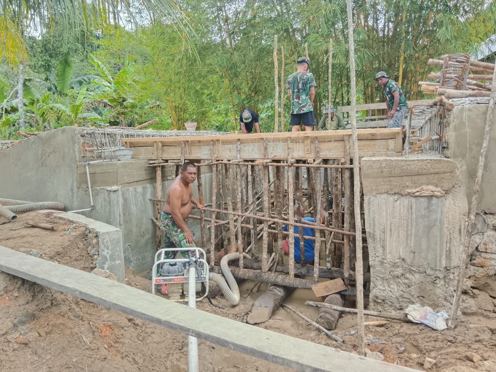 Dalam aksi gotong royong tersebut, sejumlah prajurit TNI terlihat teliti menyusun rangka kayu dan memperkuat penyangga dasar untuk memastikan struktur cetakan beton benar-benar kokoh sebelum dilakukan proses pengecoran lantai jembatan.
