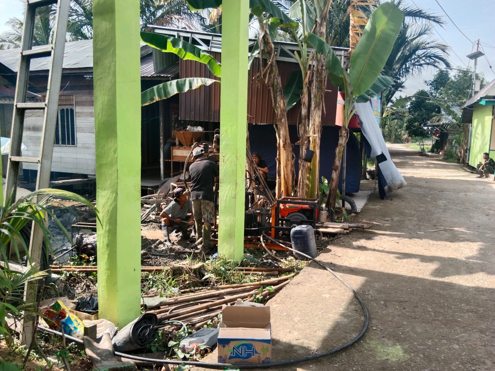 Pada tahapan terbaru, sejumlah personel terlihat bahu-membahu melakukan pemasangan gelagar dan penyusunan lantai rumah menggunakan material papan kayu yang berkualitas.