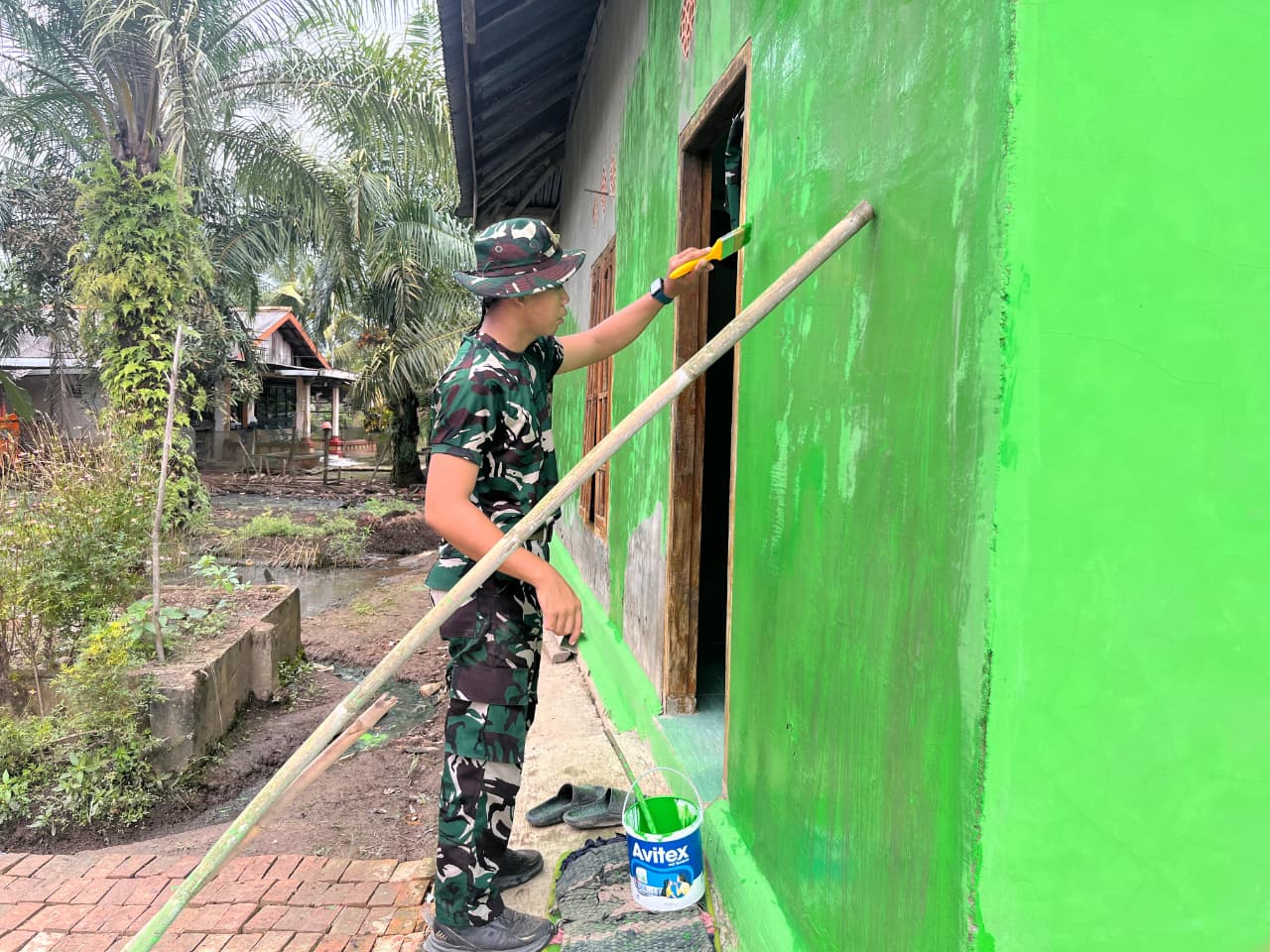 Saat ini, Satgas TMMD bersama masyarakat setempat telah memulai proses pengecatan mushola. Tampak anggota Satgas TMMD dan warga bergotong royong mengaplikasikan cat berwarna cerah pada dinding mushola, memberikan tampilan baru yang lebih segar dan menarik.