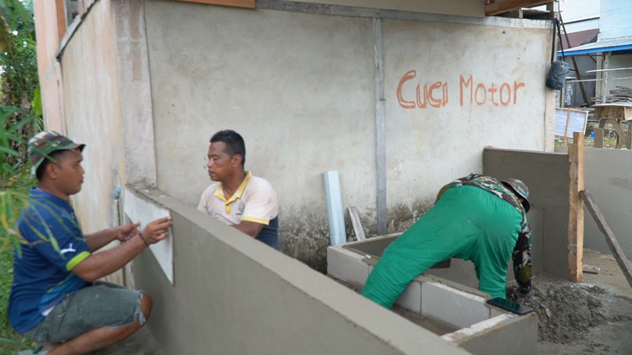 Dengan kerja sama dan gotong royong antara Satgas TMMD dan masyarakat, pekerjaan plester dinding poskamling berjalan lancar. Kegiatan ini dilakukan untuk memperkuat struktur bangunan sekaligus memperindah tampilan poskamling yang nantinya akan digunakan warga sebagai sarana menjaga keamanan lingkungan.