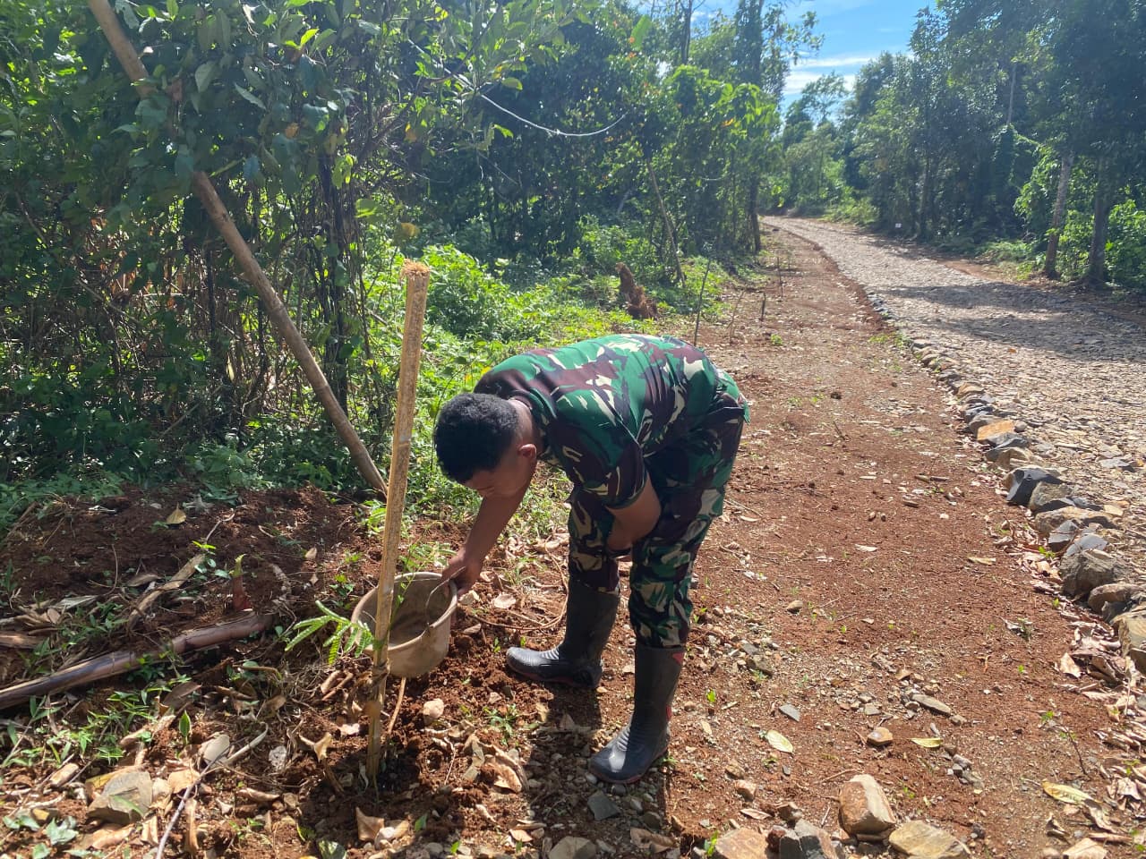 Dalam kesempatan tersebut, para anggota Satgas tampak bekerja sama dengan penuh kekompakan. Mereka membawa wadah air secara bergantian untuk menyiram pohon-pohon muda di sepanjang jalur jalan desa yang baru selesai diperkeras. Selain memastikan suplai air yang cukup bagi tanaman, mereka juga menegakkan patok kayu di setiap pohon yang ditanam untuk memberi tanda dan perlindungan dari gangguan ternak maupun aktivitas manusia.