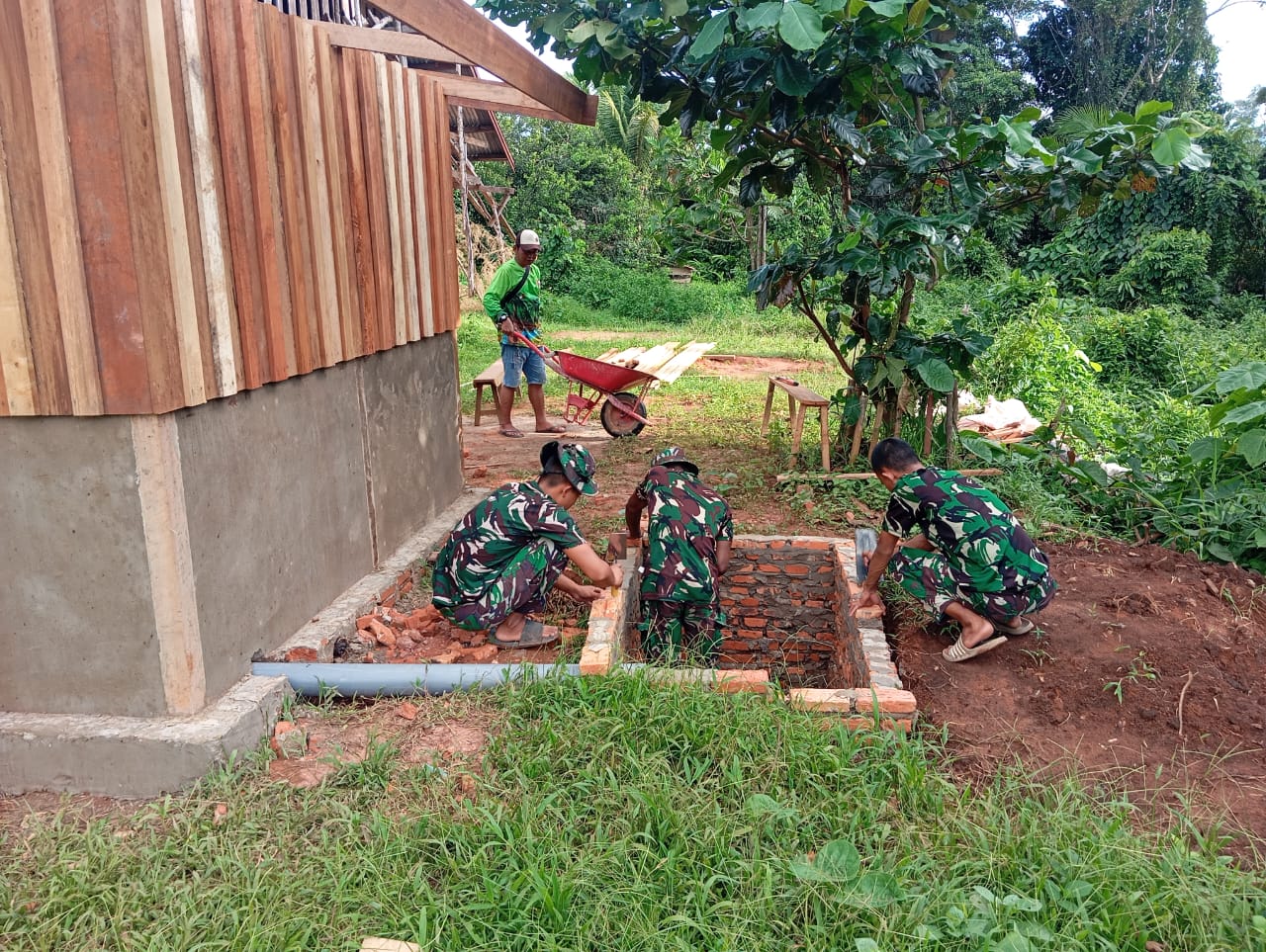Satgas TMMD fokus menyusun batu bata untuk dinding septic tank, Pembuatan septic tank ini merupakan tahapan penting dalam pembangunan MCK, karena akan berfungsi sebagai tempat penampungan dan pengolahan limbah, sehingga menjaga kebersihan lingkungan sekitar.