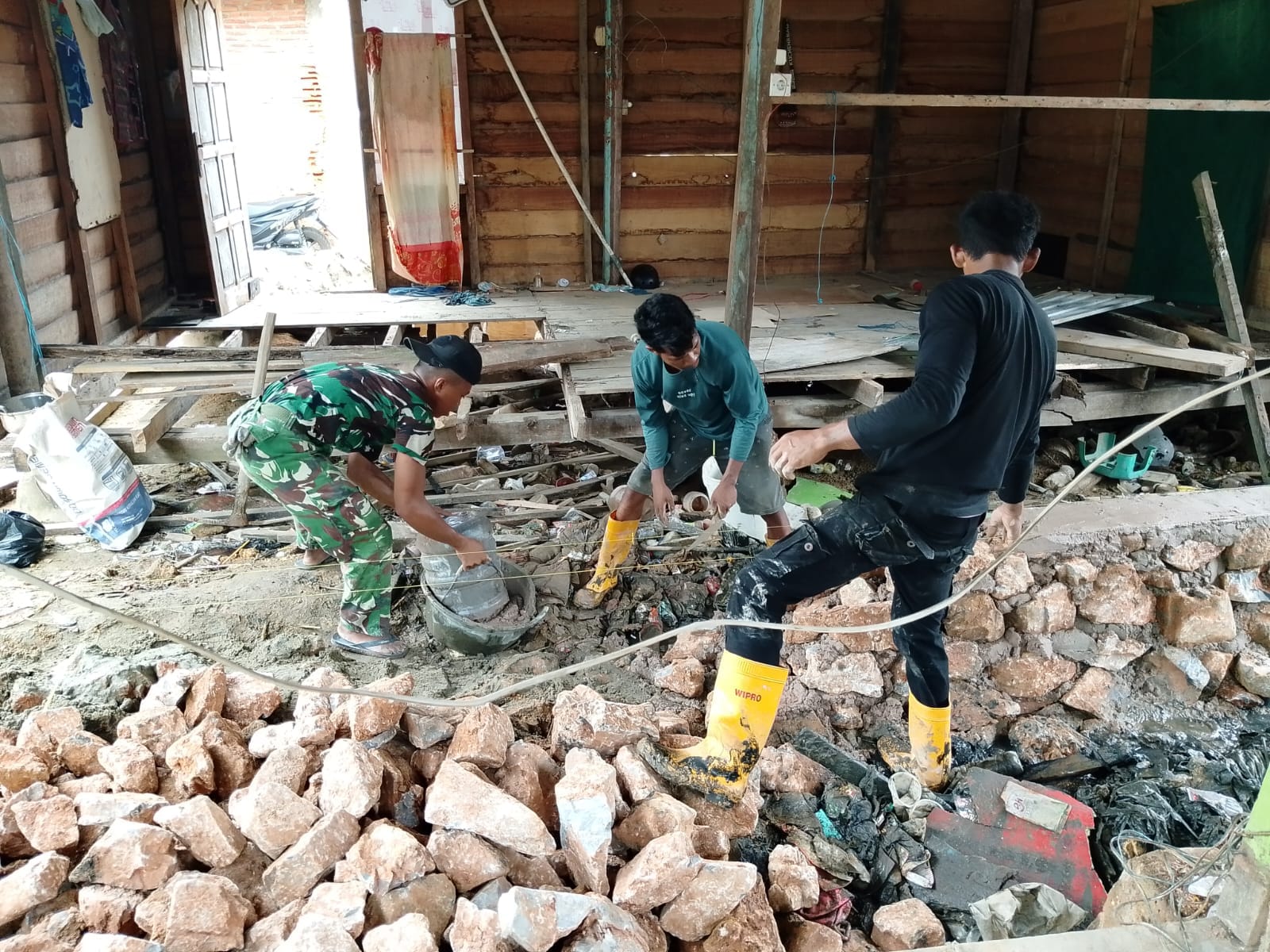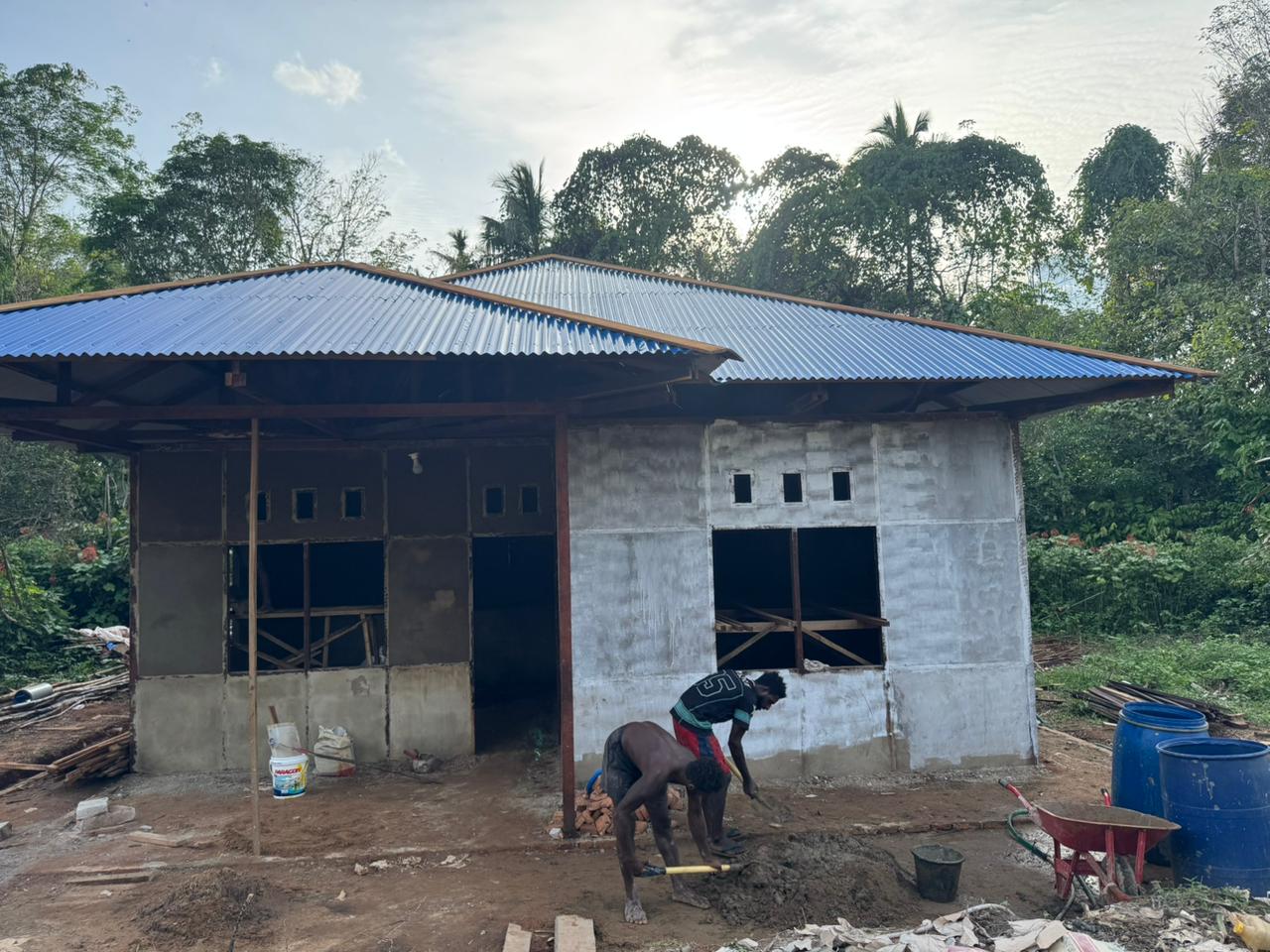 Mappi – Pembangunan rumah Bapak Nikolaus Abohoy di Kampung Yibin, Distrik Venaha, Kabupaten Mappi, terus menunjukkan progres yang menggembirakan. Satgas TMMD (TNI Manunggal Membangun Desa) ke-127 Kodim 1704/Mappi terus berupaya mewujudkan impian Bapak Nikolaus untuk memiliki hunian yang layak, dengan fokus pada pemasangan seng, pemasangan batu, dan plester dinding pada hari Minggu (01/03/2026).