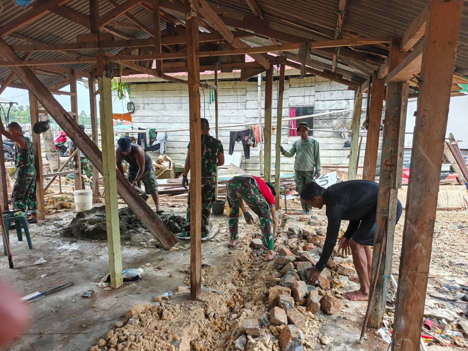 Personel Satgas bersama warga bahu-membahu membongkar dan membangun kembali struktur bangunan yang sebelumnya memprihatinkan.