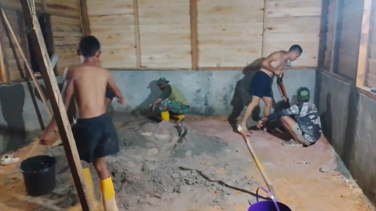Para prajurit bahu-membahu melaksanakan pekerjaan fisik, mulai dari pemasangan rangka kayu bagian atas hingga proses perabatan atau pemeluran lantai gedung.