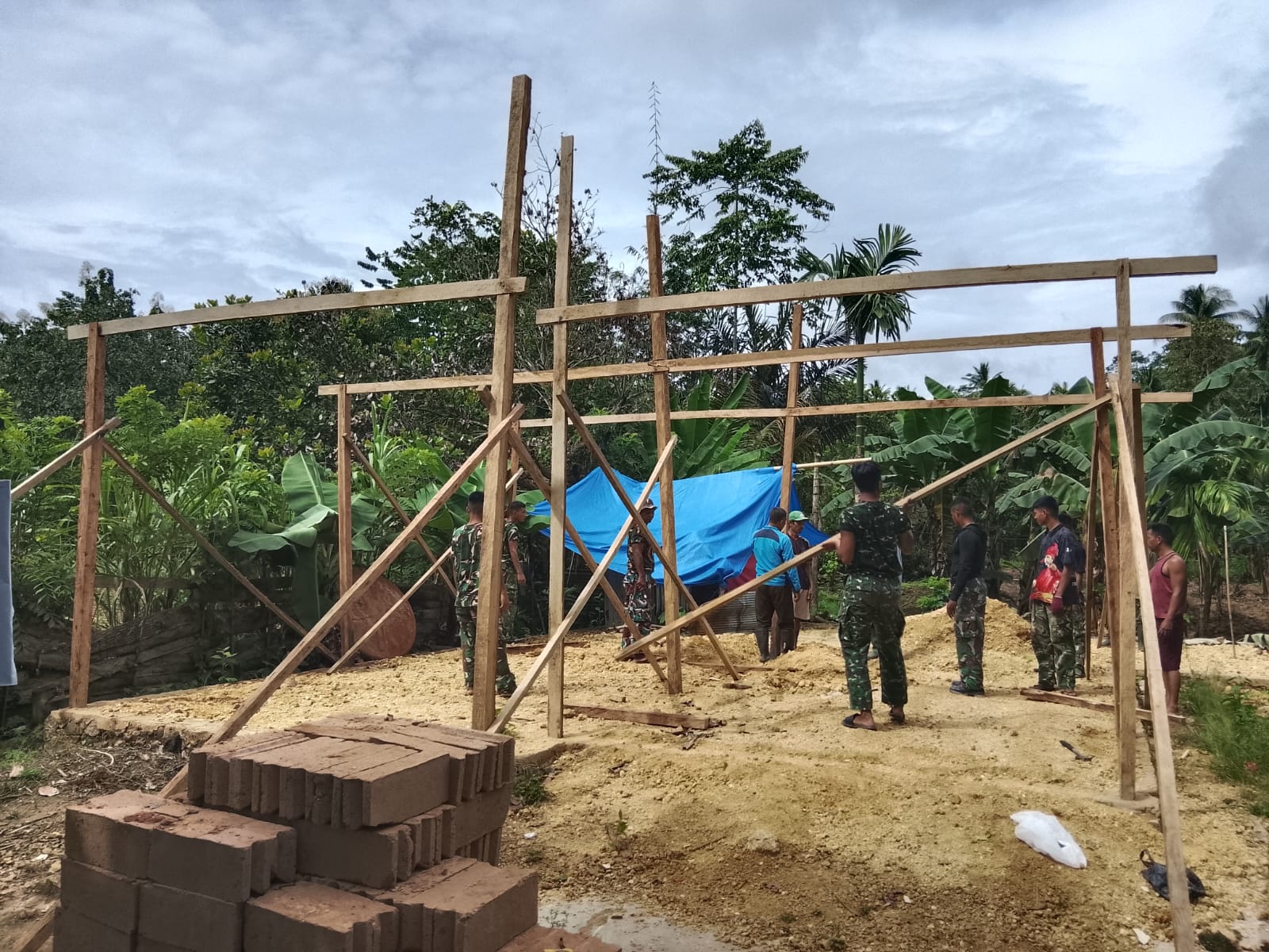 Pada Selasa (3/3), sejumlah personel Satgas TMMD bersama warga bahu-membahu melaksanakan pembangunan rangka rumah untuk program Rumah Layak Huni (RLTH) di Kelurahan Sambuli.